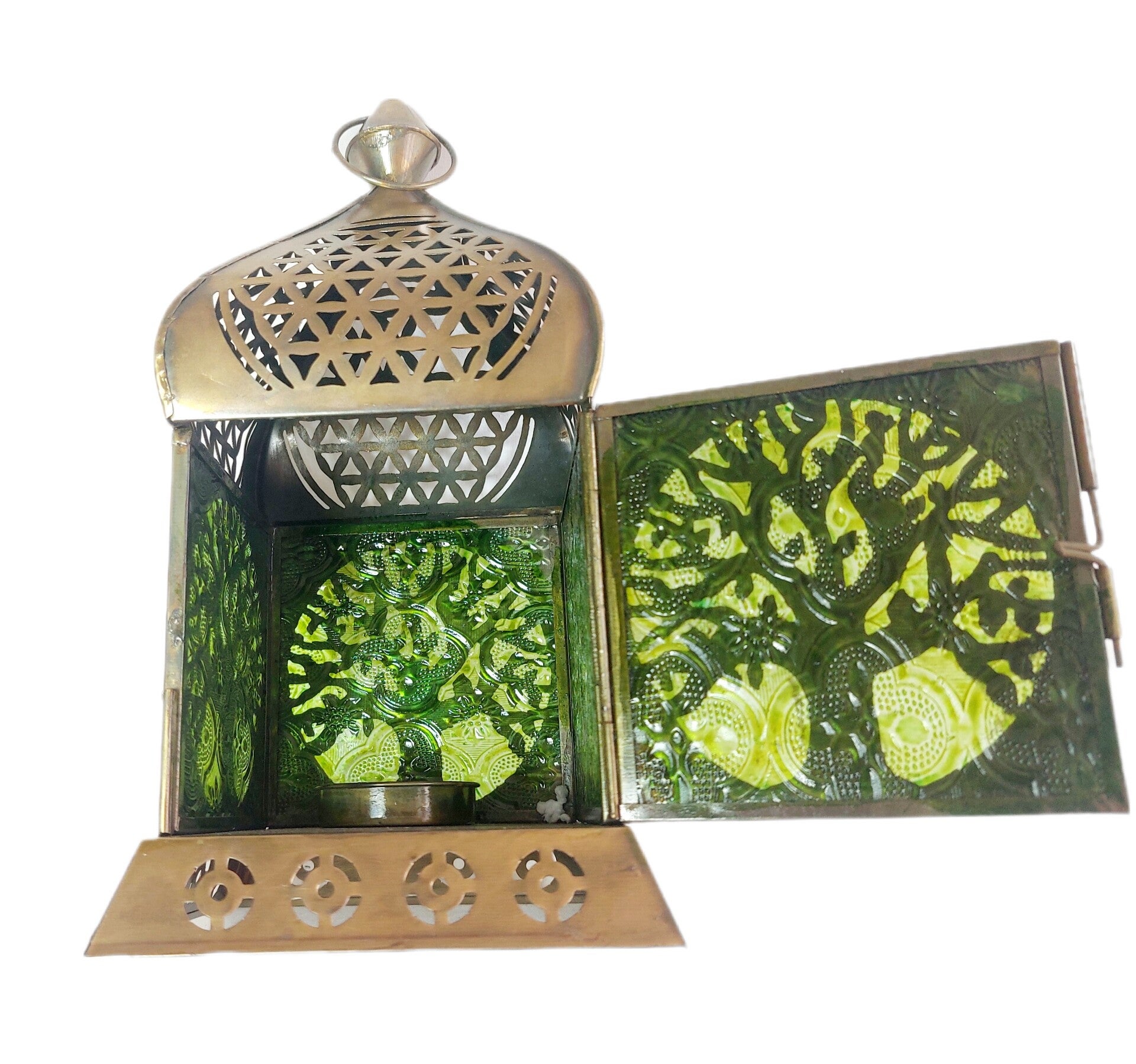 Material: Eisen golden und Grünglas mit strukturiertem Echtglas und Teelichteinsatz