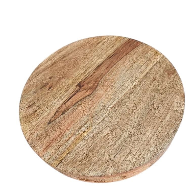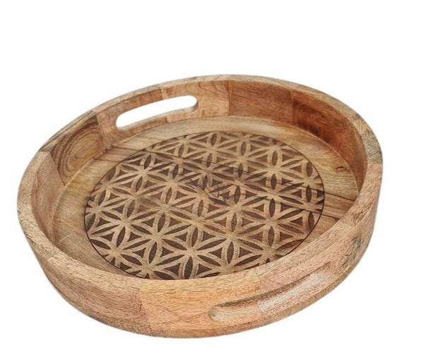 Rundes Serviertablett aus Mangoholz mit einer detaillierten Gravur des Blume des Lebens Symbols. Ideal zum Servieren von Tee oder Getränken mit Achtsamkeit oder als dekoratives Element in einem bewussten Umfeld.