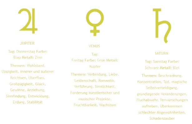 Außerdem wählen Sie idealerweise die Zutaten für einen Zauber danach aus, welche Pflanzen, Steine, Farben, Metalle etc. dem für das Ritual als Unterstützer auserwählten Planeten zugeordnet sind.
